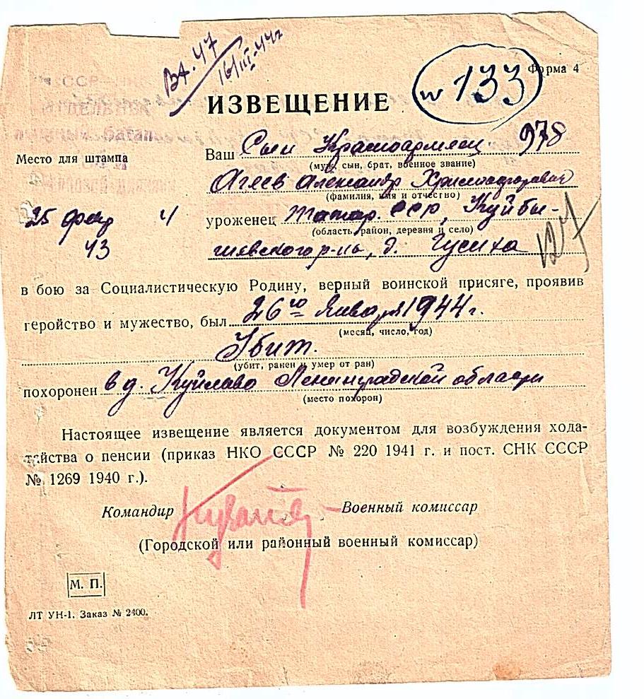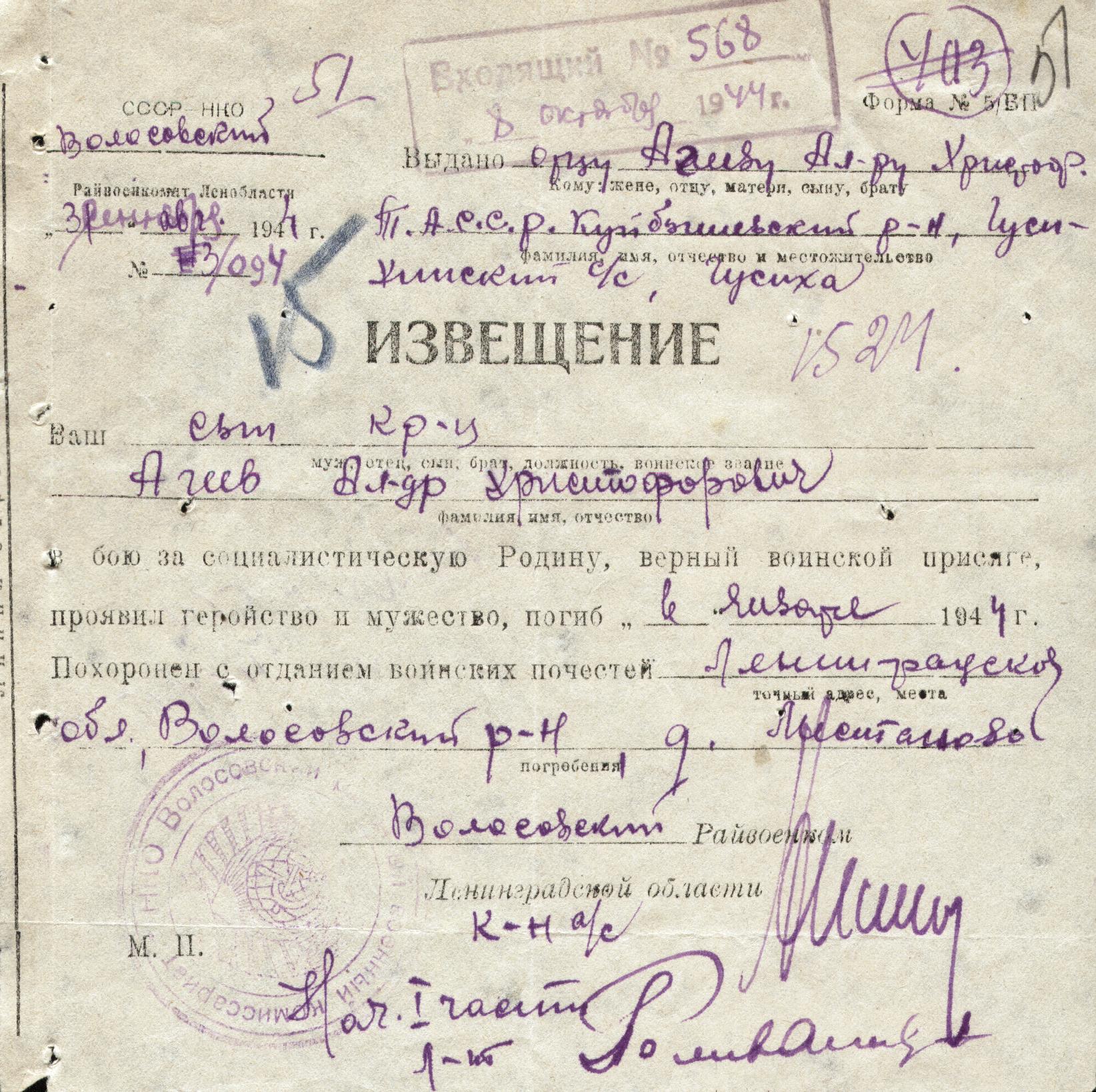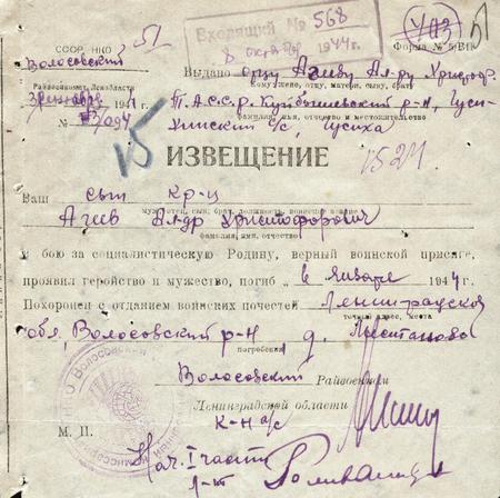 Дата выбытия 26.01.1944