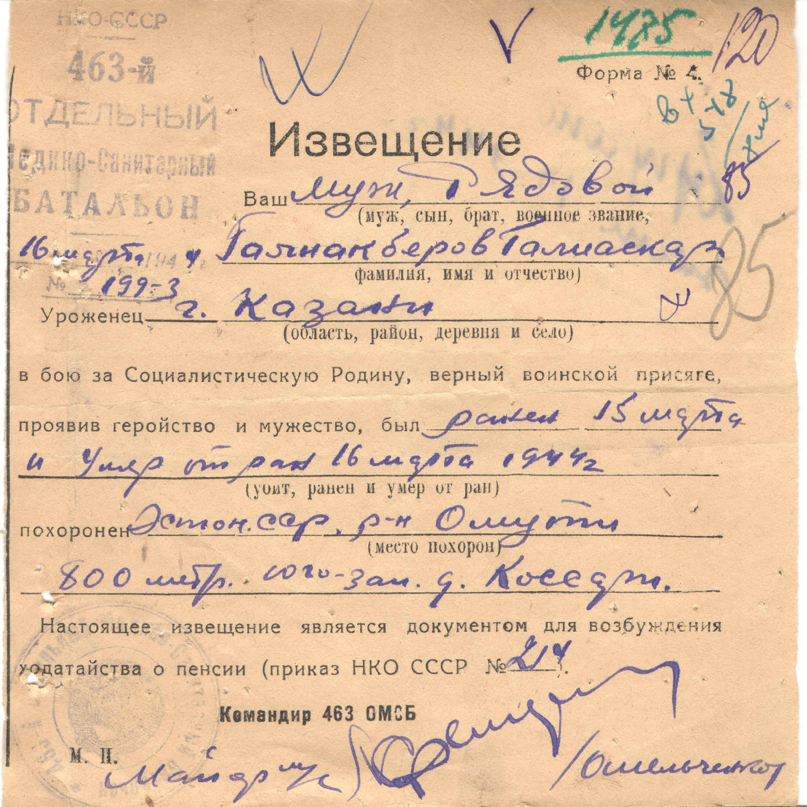 Опубликовано 8 июня, 2009 - 11:50 пользователем Михаил Черепанов Учетные данные г.р.: 1910место рождения: г.КазаньРВК: Кировским РВКзвание: кр-цместо службы: 1240 сп,372 сддень выбытия: 16месяц выбытия: 3год выбытия: 1944причина выбытия: уобл. выбытия: Эстонияместо выбытия: Омути р-н,д.Коссариопись: ВМА 463дело: 3лист: 22госпиталь: 463 омедсбприм.: 1 Комментарии Re: ГАЛИАКБЕРОВ ГАЛИАСКАР Постоянная ссылка (Permalink) Опубликовано 12 ноября, 2013 - 22:19 пользователем Мидхатов Ильхам... Мидхатов Войдите или зарегистрируйтесь, чтобы отправлять комментарии