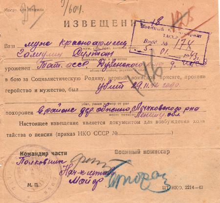 Опубликовано 8 июня, 2009 - 11:50 пользователем Михаил Черепанов Погиб(ла) Учетные данные г.р.: 1912область рождения: ТатАССРместо рождения: с.Инся Дубъязский районРВК: Дубъязский РВКзвание: кр-цместо службы: 717 сп,170 сддень выбытия: 29месяц выбытия: 11год выбытия: 1942причина выбытия: убитобл. выбытия: Новгородская обл.место выбытия: Лычковский р-н, д.Обжиноприм.: 0 Комментарии Re: ГАЛИУЛЛИН СУЛТАН ГАЛИУЛЛОВИЧ Постоянная ссылка (Permalink) Опубликовано 15 января, 2014 - 21:36 пользователем Мидхатов Ильхам... Мидхатов Войдите или зарегистрируйтесь, чтобы отправлять комментарии