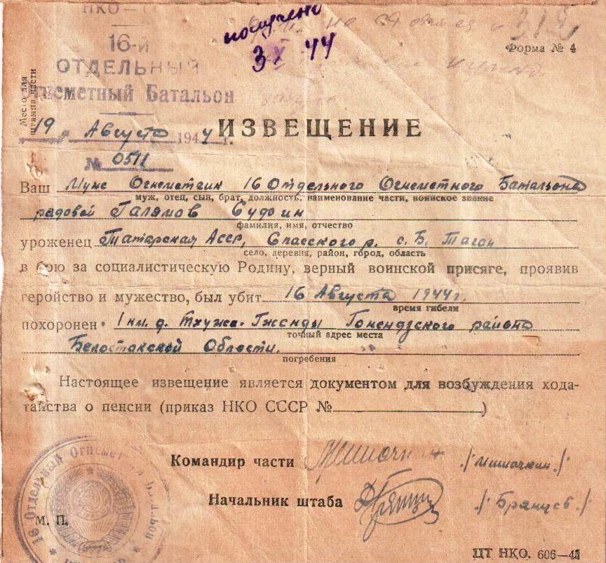 Дата и место призыва 14.07.1941, Спасский РВК, Татарская АССР