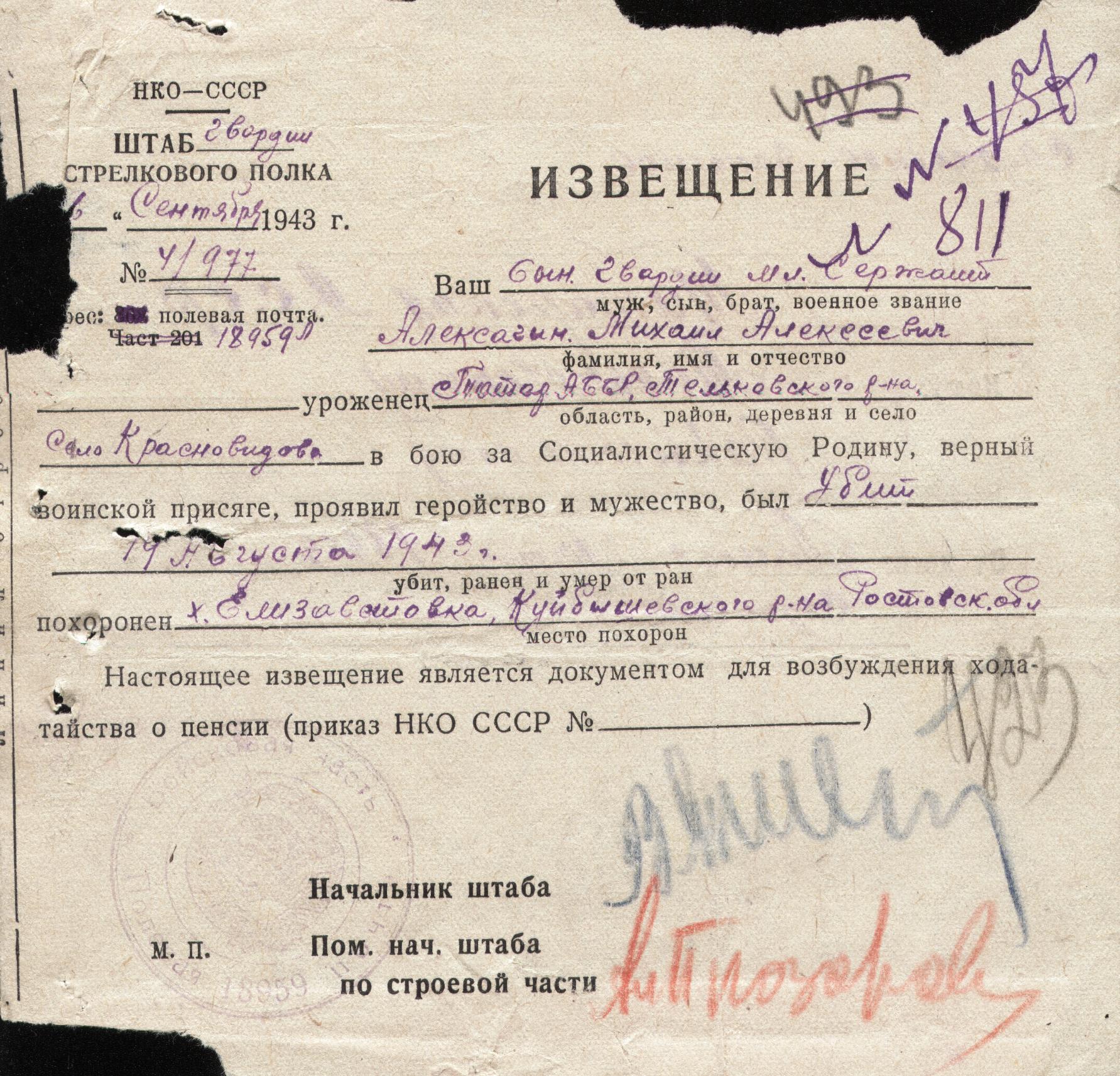 Первичное место захоронения: Ростовская обл., Куйбышевский р-н, х. Елизаветинский. 230