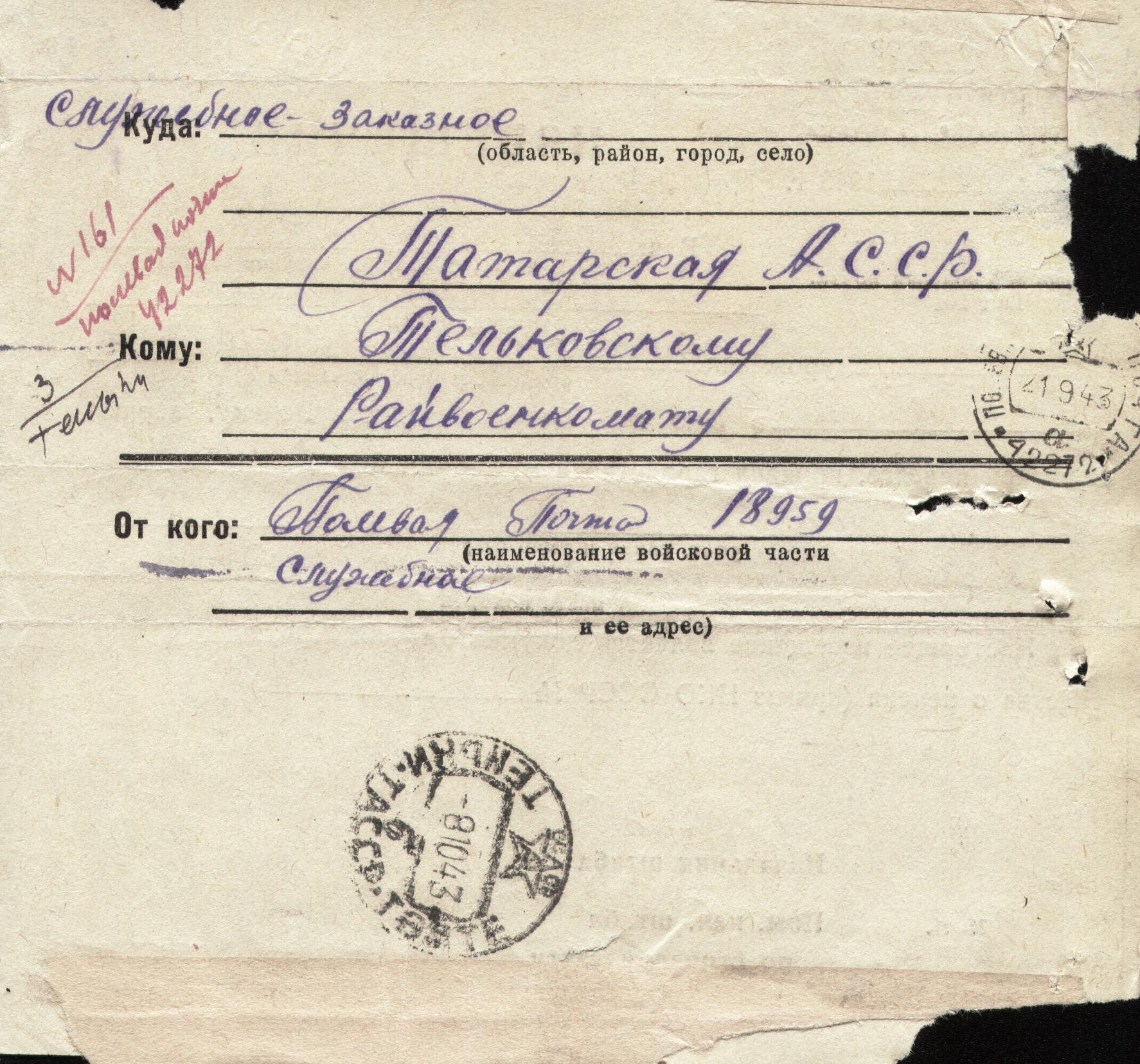 Место призыва: Теньковским (Чистопольским) РВК