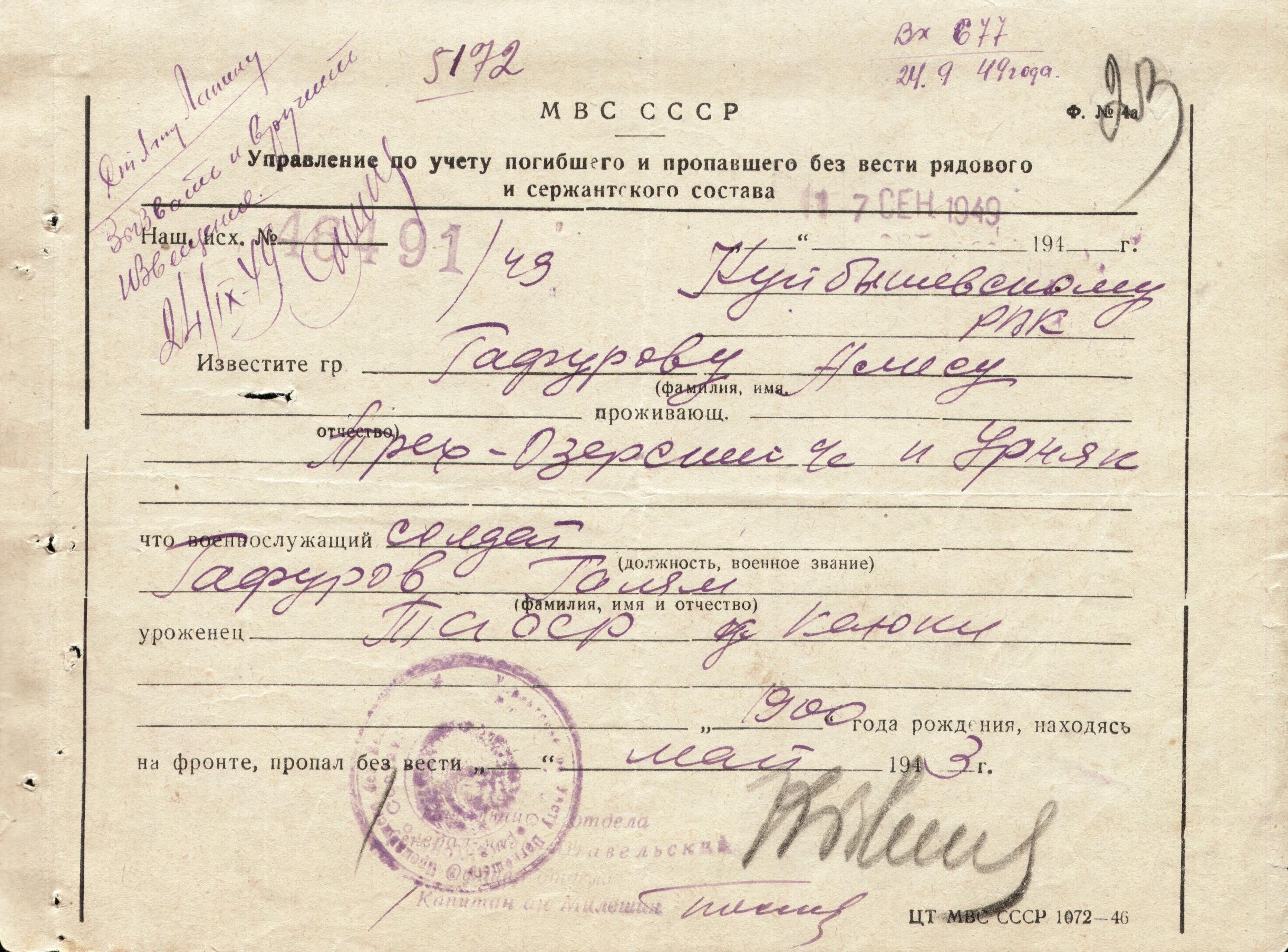 Опубликовано 8 июня, 2009 - 11:50 пользователем Михаил Черепанов Учетные данные г.р.: 1900место рождения: с.КаюкиРВК: Куйбышевским РВКзвание: кр-цмесяц выбытия: 5год выбытия: 1943причина выбытия: бприм.: 0 Комментарии Re: ГАФУРОВ ГАЛЛЯМ(ГАНЯШ) Постоянная ссылка (Permalink) Опубликовано 24 декабря, 2013 - 16:40 пользователем Мидхатов Ильхам... Мидхатов Войдите или зарегистрируйтесь, чтобы отправлять комментарии